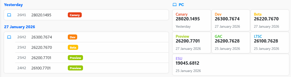 - 카나리 채널: 카나리 채널은 현재 다소 특이한 Windows 11 26H1 28000(브로민) 빌드에 사용되고 있습니다. 이 빌드는 봄에 OEM 업체에 배포될 예정입니다. 이후 특정 CPU에 대한 새로운 기능이 활성화됩니다 . 현재 카나리 채널에서 빌드 28020에 대한 테스트가 진행 중입니다. 하지만 일반 사용자에게는 Windows 11 26H2가 가을에 출시될 예정입니다. 내부적으로는 빌드 29xxx(크립톤) 준비 작업이 이미 활발히 진행되고 있습니다. 이 빌드는 내부용으로만 사용될 것입니다.
