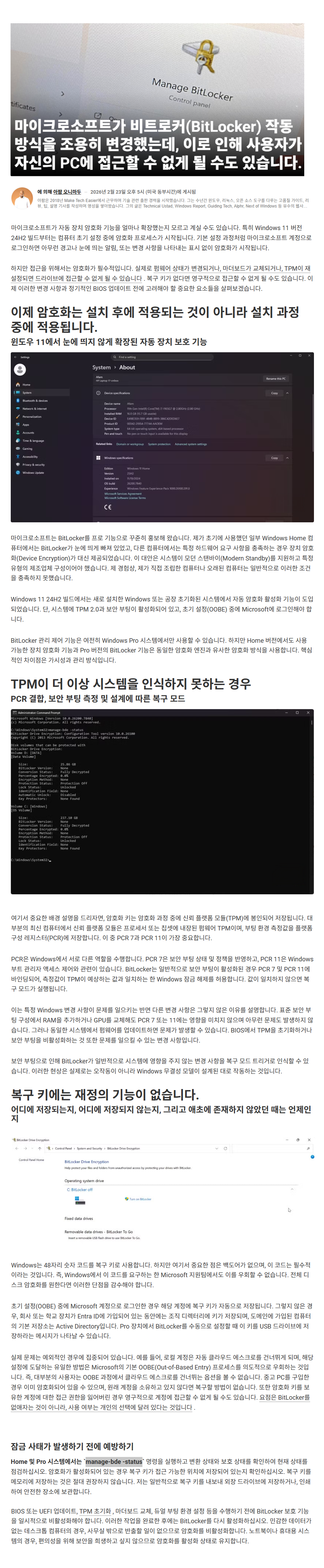 로컬 계정 사용자들은 크게 걱정할 필요없지만, MS 계정 사용자들은 BitLocker가 작동하는 경우가 있습니다...