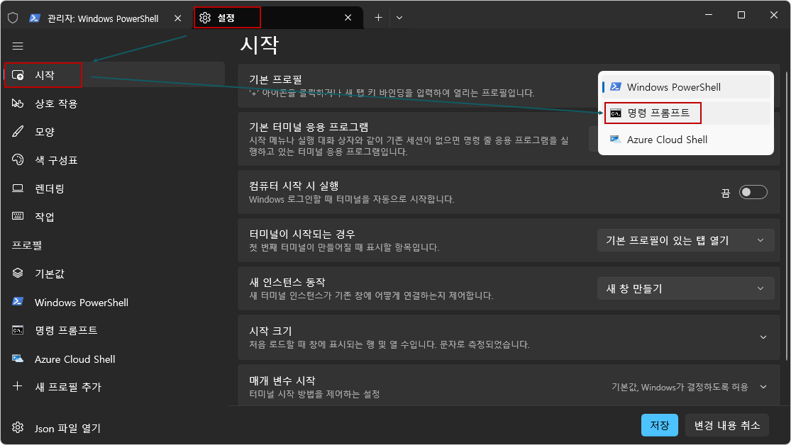 아래와 같이 파워쉘의 설정에서 명령프롬프트로 열리도록 변경 가능합니다...ㅎ