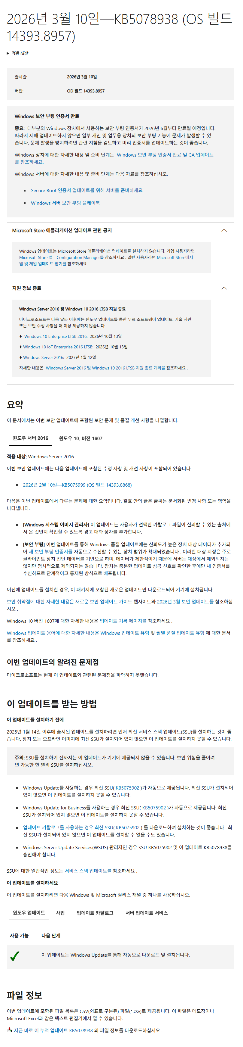 KB5078938 = 최신 누적 업데이트(14393.8957) (Last Cumulative Update : LCU) (2026-03-10)