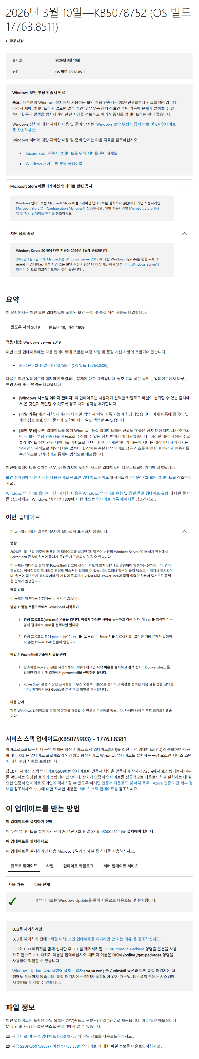 KB5078752 = 최신 누적 업데이트(17763.8511) (Last Cumulative Update : LCU) (2026-03-10)