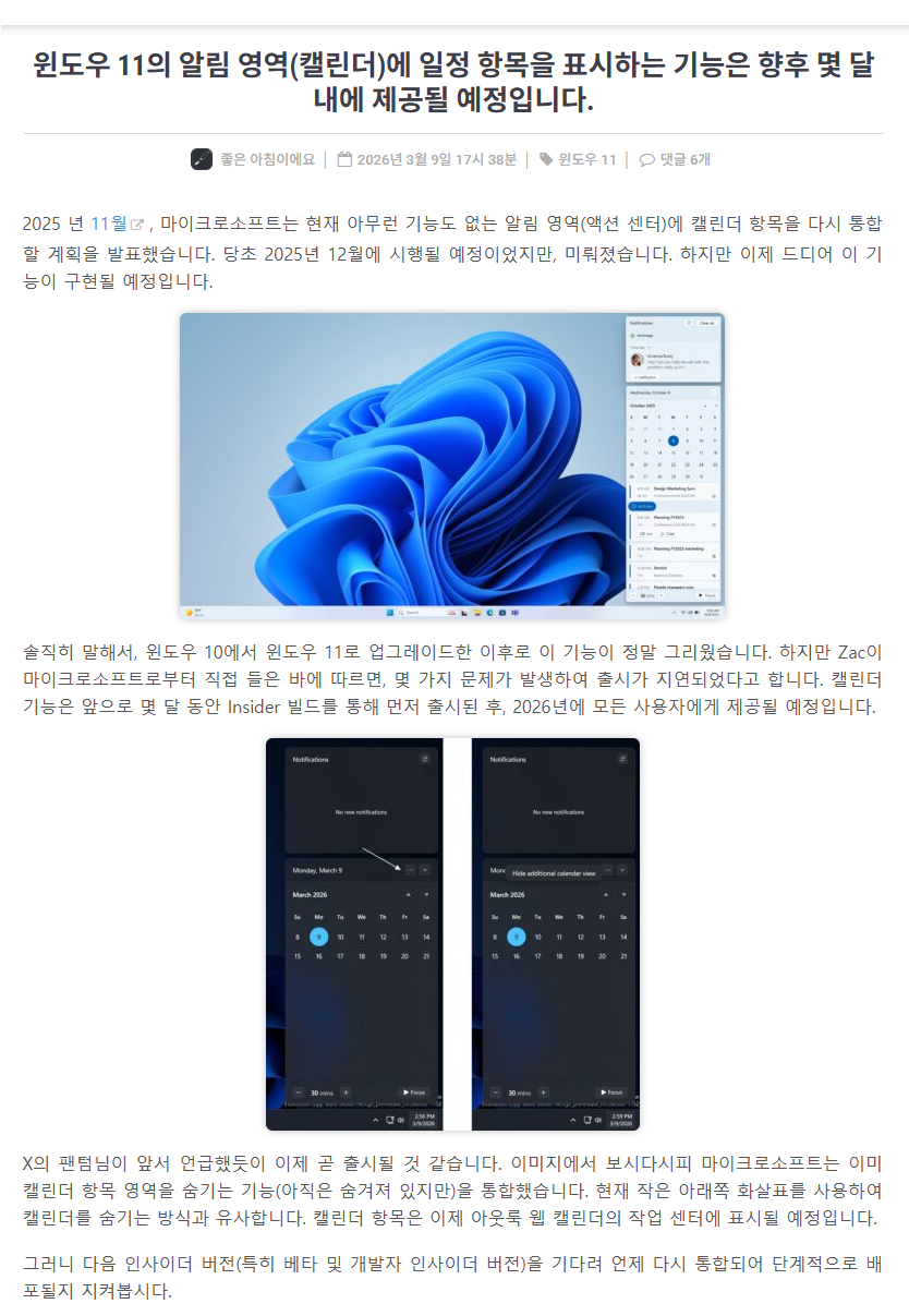 윈도우 11의 알림 영역(캘린더)에 일정 항목을 표시하는 기능은 향후 몇 달 내에 제공될 예정입니다.