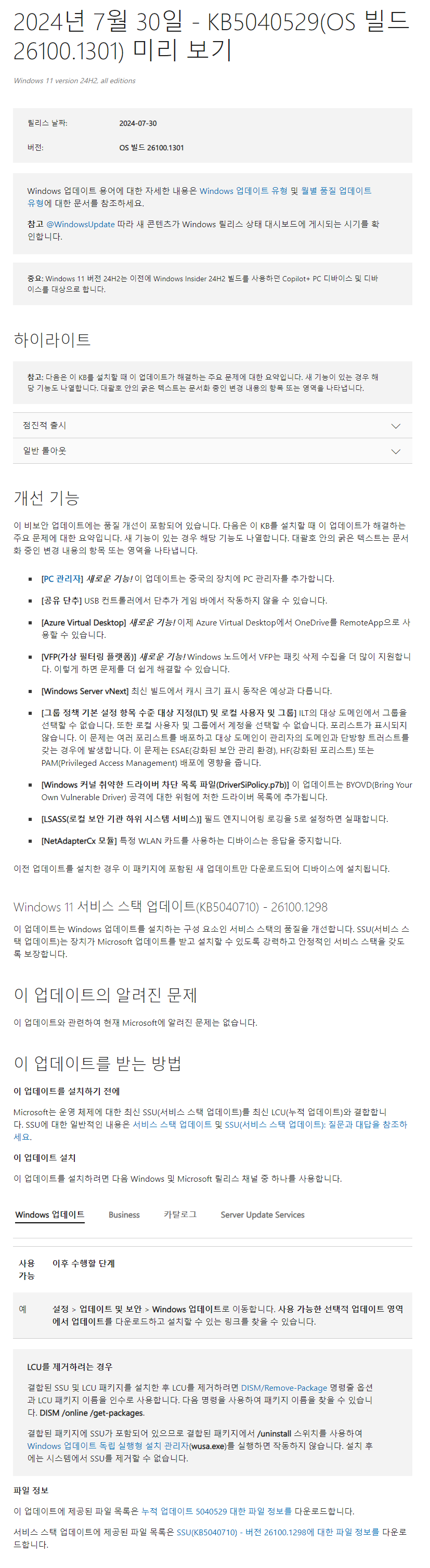 KB5040529 = 누적 업데이트(26100.1301) (Cumulative update : CCU) (2024-07-30)