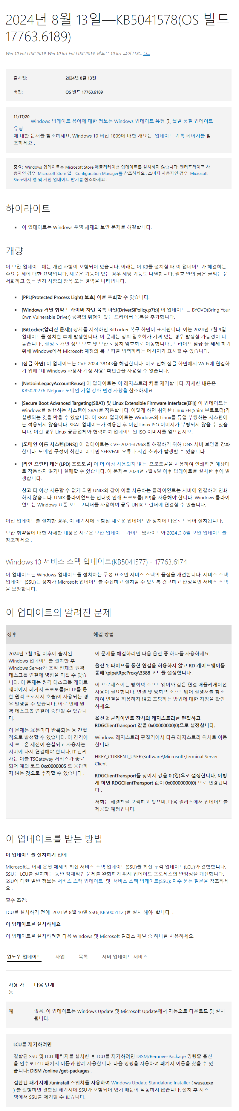 KB5041578 = 누적 업데이트(17763.6189) (Cumulative update : CCU) (2024-08-13)