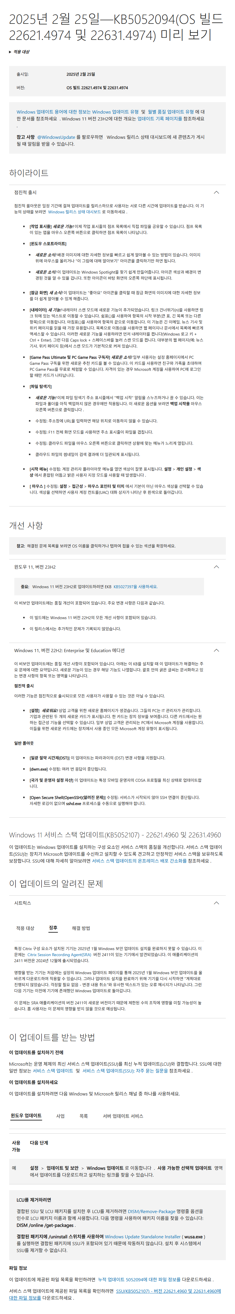 KB5052094 = 최신 누적 업데이트(22621.4974 / 22631.4974) (Last Cumulative update : LCU) (2025-02-25)
