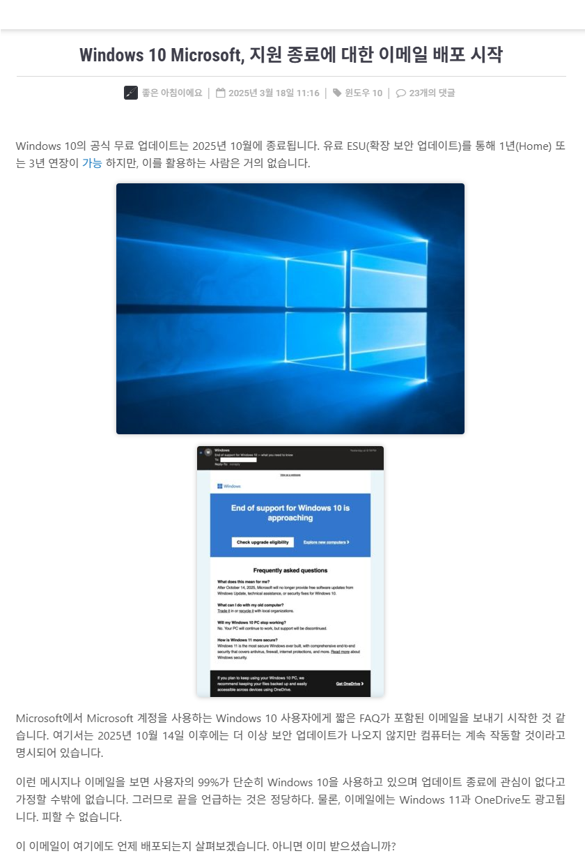 MS, MS 계정 사용자에게 Windows 10 지원 종료 이메일 배포