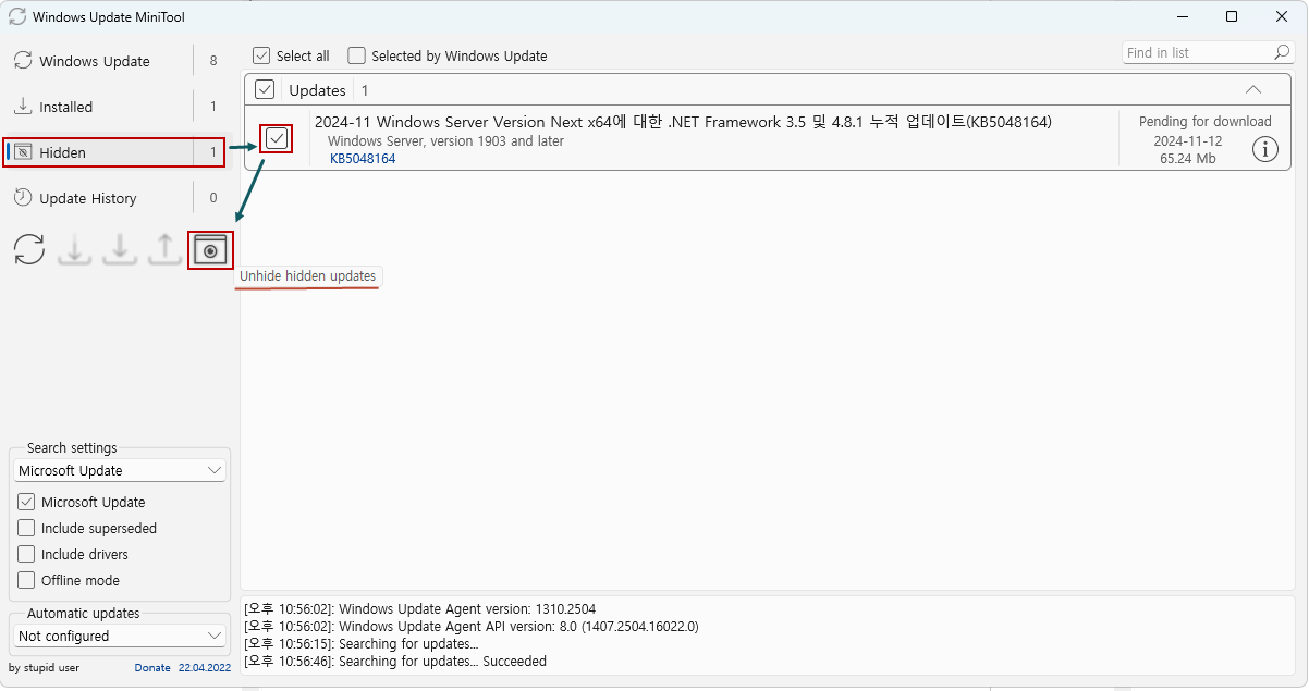 숨김 해제하고자하는 업데이트를 선택하고 [숨김 해제] 버튼을 누르면 자동업데이트에 다시 목록이 나타납니다...ㅎ