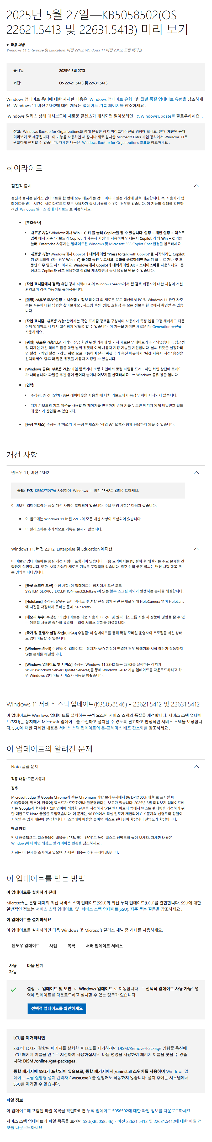 KB5058502 = 최신 누적 업데이트(22621.5413 / 22631.5413) (Last Cumulative update : LCU) (2025-05-27)