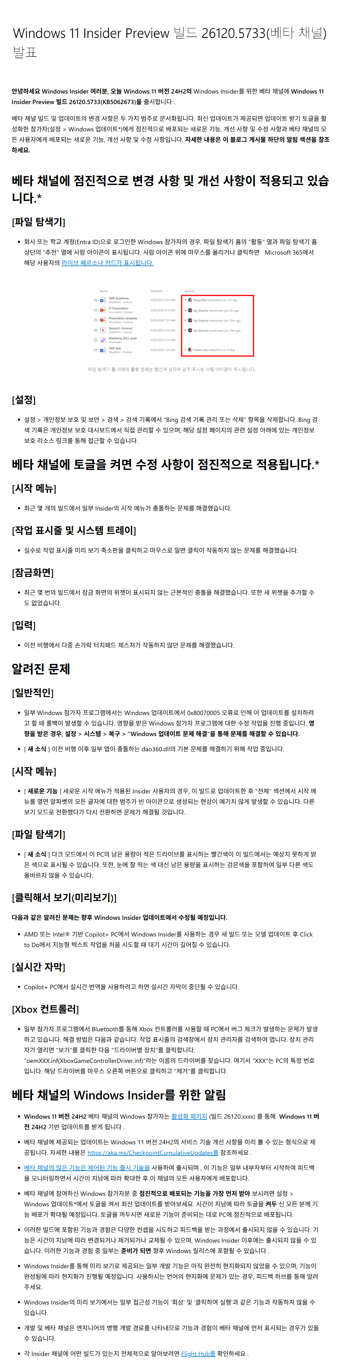 이 업데이트는 인사이드 참가자들에게 테스트 및 피드백 목적으로 배포되는 빌드입니다.