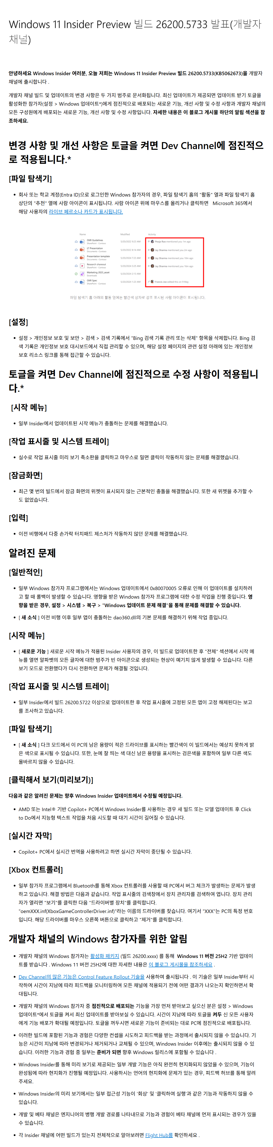 Windows Insider 여러분, 오늘 저희는 Windows 11 Insider Preview 빌드 26200.5733을 개발자 채널에 출시합니다 .
