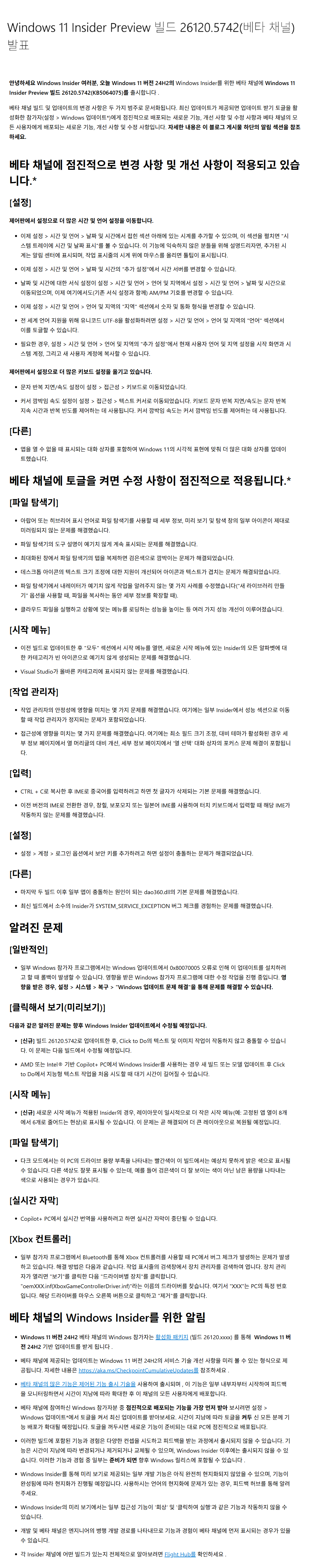 Windows 11, 24H2 Beta 채널 Insider Preview 빌드 누적 업데이트 파일(KB5064075) : 26120.xxxx → 26120.5742 [ = Beta 채널 참가자 전용]