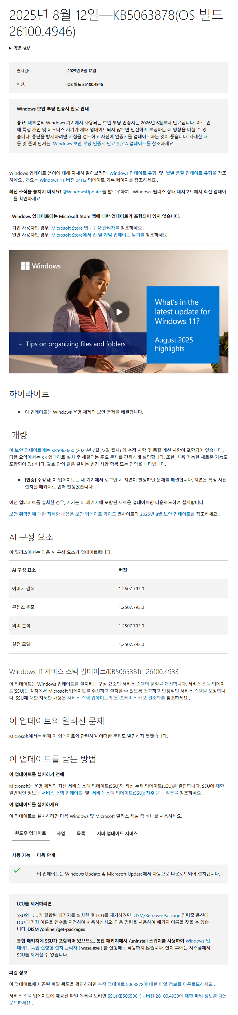 KB5063878 = 최신 누적 업데이트(26100.4946) (Last Cumulative update : LCU) (2025-08-12)