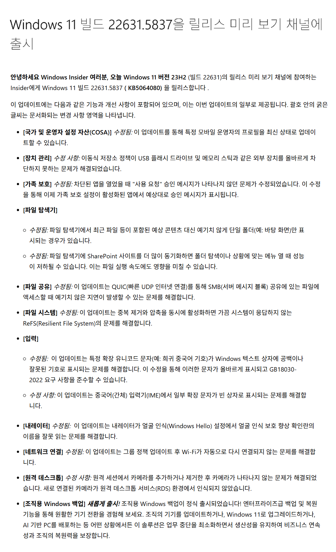 Windows 11, 23H2 RP 채널 Insider Preview 빌드 누적 업데이트 파일(KB5064080) : 22631.x → 22631.5837 [ = RP 채널 참가자 전용] [배포 종료]