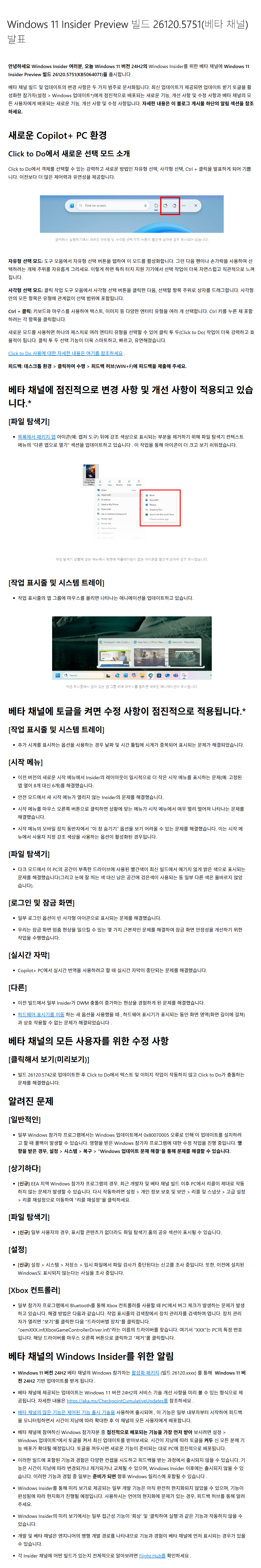 이 업데이트는 인사이드 참가자들에게 테스트 및 피드백 목적으로 배포되는 빌드입니다.
