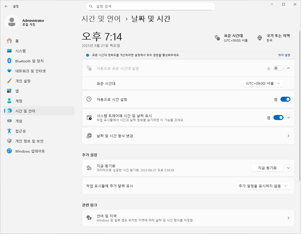 📌⇒ 시간 및 언어 섹션이 많이 변경되었다는데,