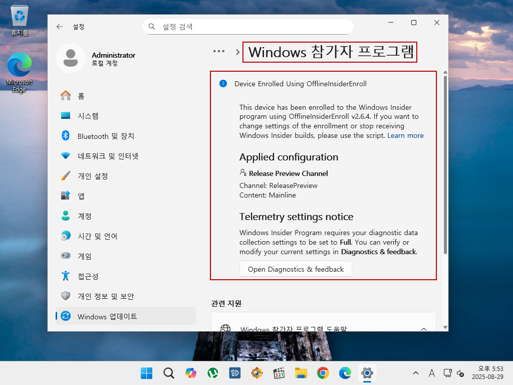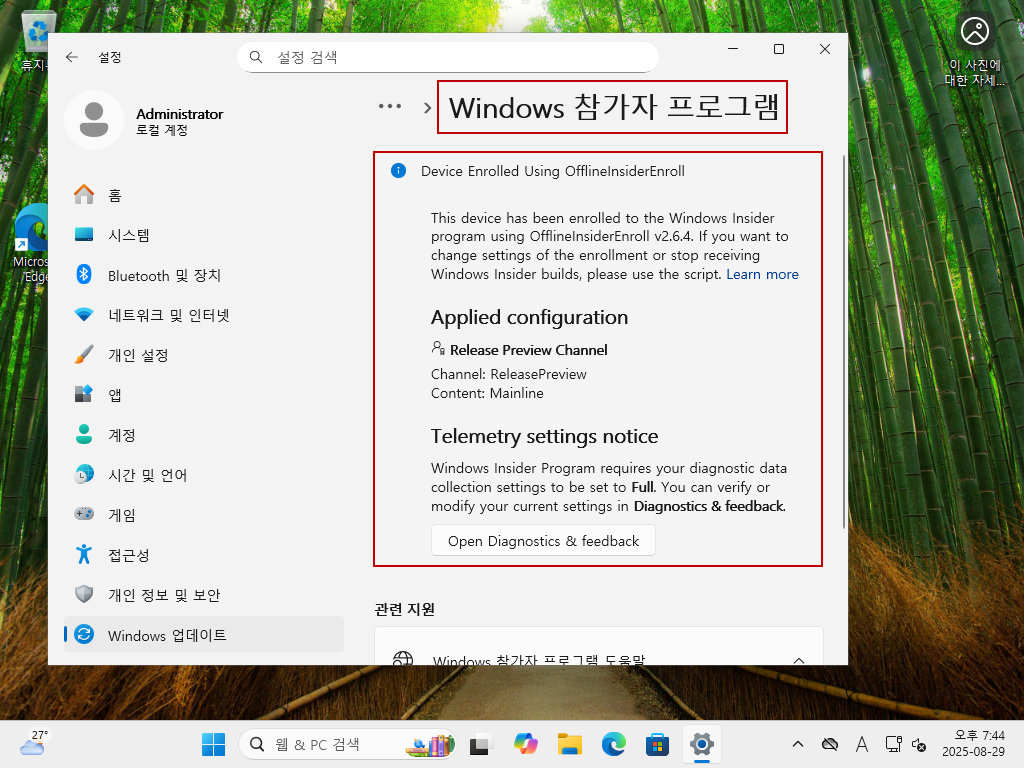 4. Windows Update의 [Windows 참가자 프로그램] 창을 열면 이미 RP 채널에 등록이 되어 있는 상태