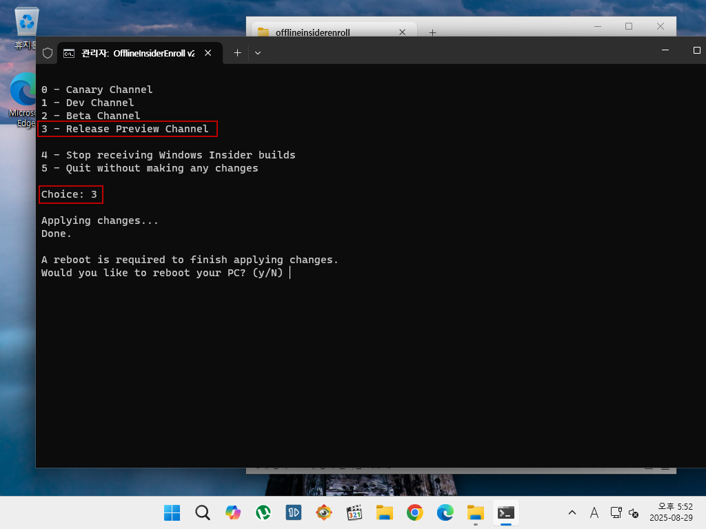 1) 아래 스크립트로 RP (Release Preview Channel) 채널에 등록 ---- 3번 선택
