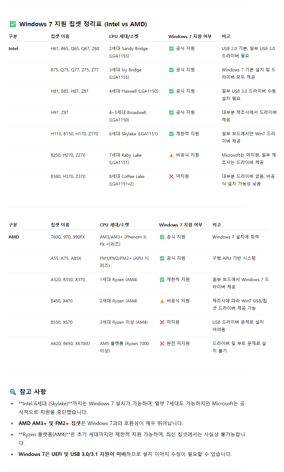 4. Windows 7 지원 CPU / 칩셋 / 메인보드 / 정리표