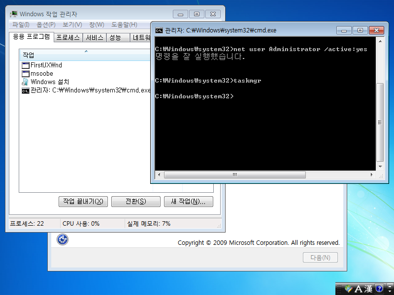 설치단계에서 사용자 계정 입력 창 → [Shift + F10키] → net user Administrator /active:yes → 엔터