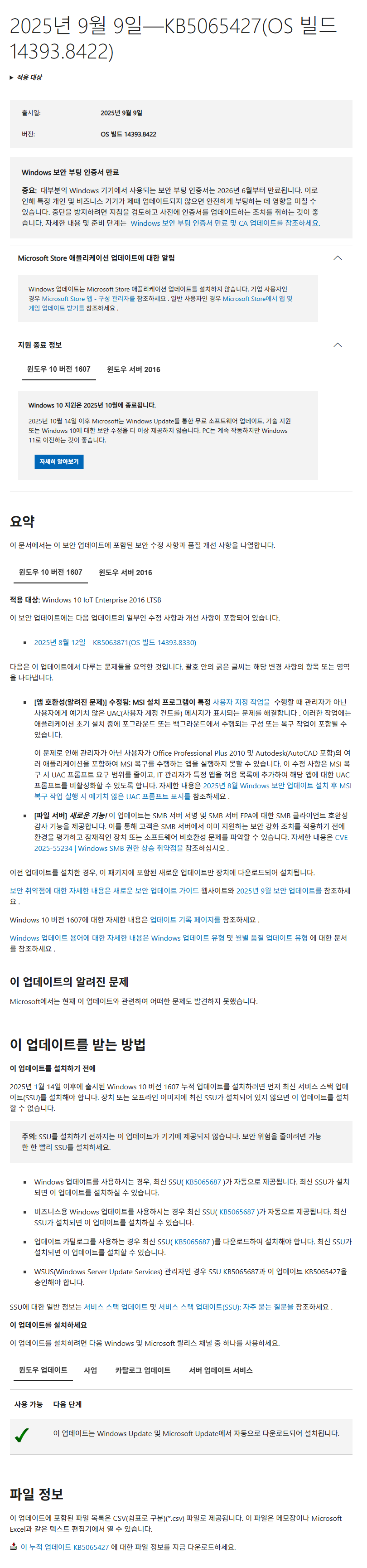 KB5065427 = 최신 누적 업데이트(14393.8422) (Last Cumulative Update : LCU) (2025-09-09)