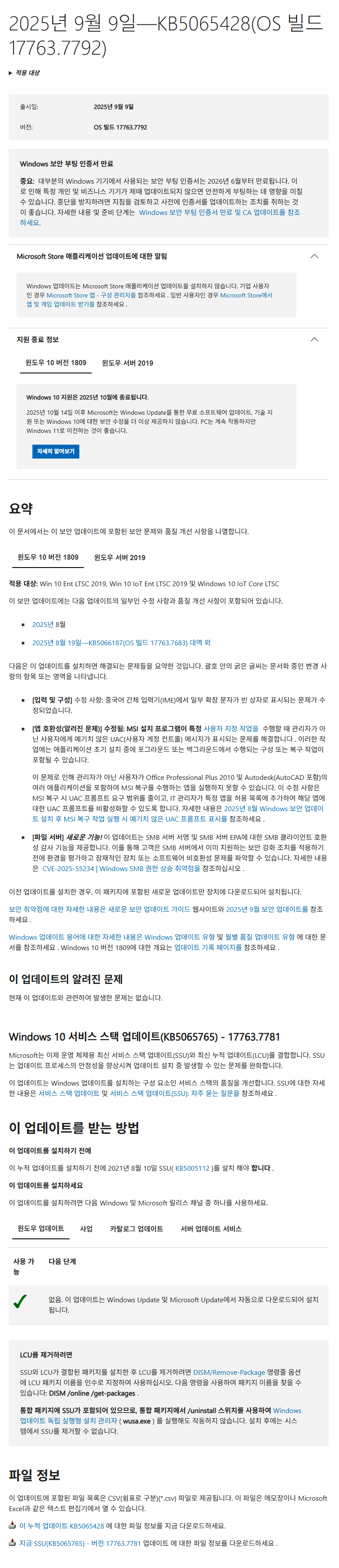 KB5065428 = 최신 누적 업데이트(17763.7792) (Last Cumulative Update : LCU) (2025-09-09)