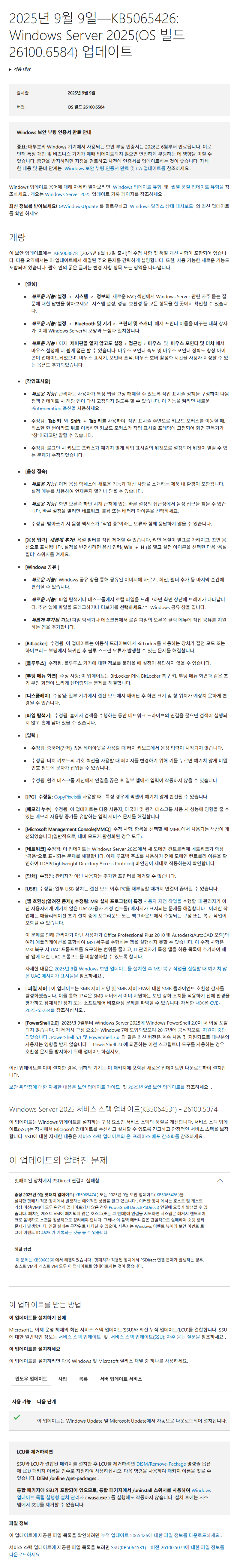 KB5065426 = 최신 누적 업데이트(26100.6584) (Last Cumulative update : LCU) (2025-09-09)