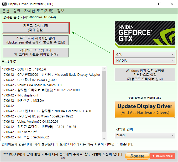 아래 붉은 박스처럼 회색으로 나오는 드라이버는 [강제 삭제]를 체크하고 [드라이버 삭제]하시길 바랍니다.