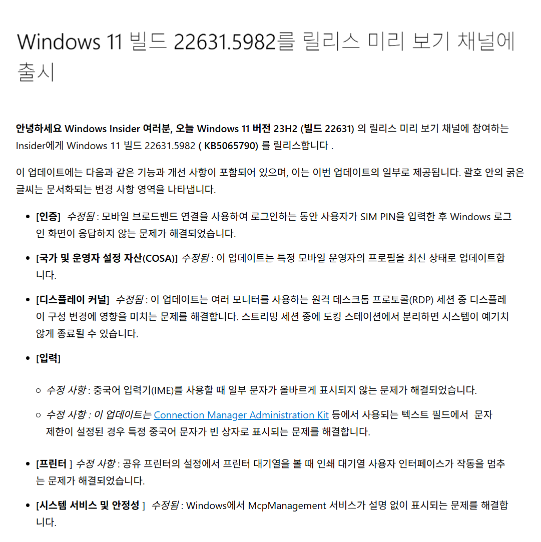 Windows 11, 23H2 RP 채널 Insider Preview 빌드 누적 업데이트 파일(KB5065790) : 22631.x → 22631.5982 [ = RP 채널 참가자 전용] [배포 종료]