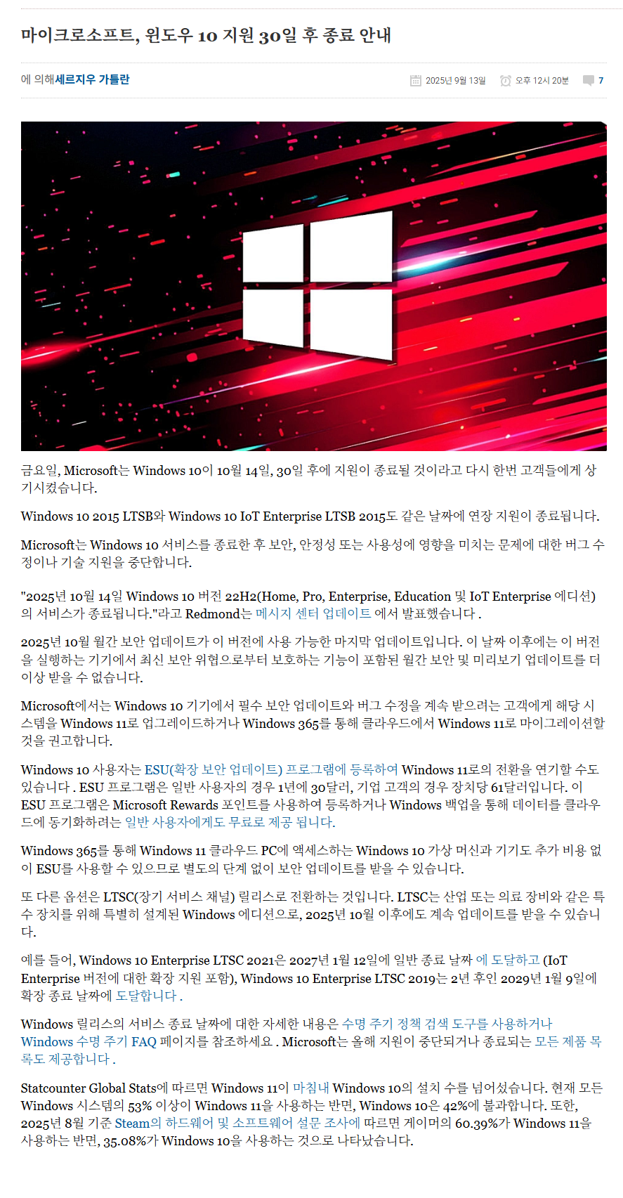 Windows 10은 2025년 10월 14일에 지원 종료됩니다.