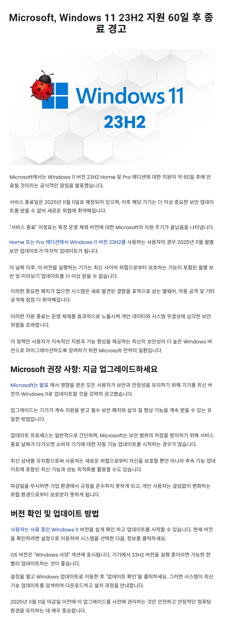 Microsoft, Windows 11 23H2 지원 60일 후 종료 경고