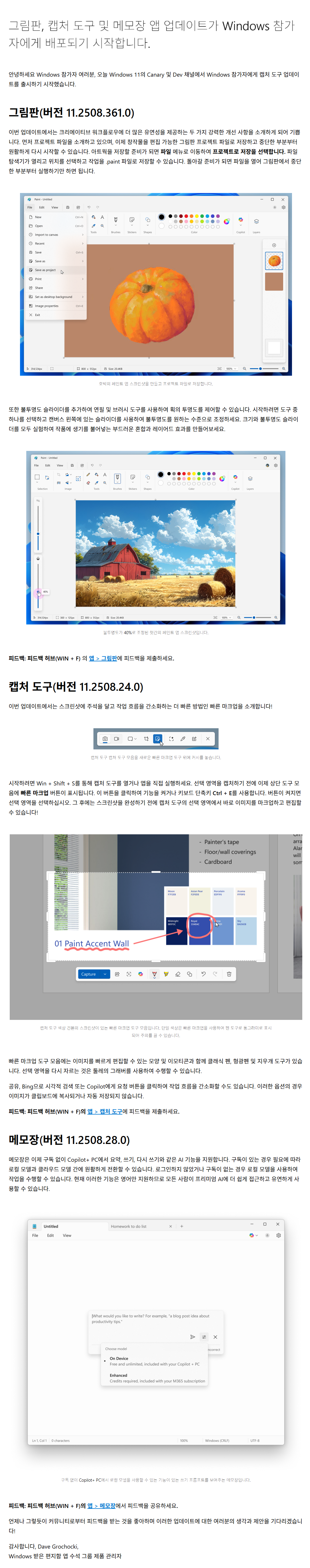 Windows 참가자에게 그림판, 캡처 도구 및 메모장 앱 업데이트가 배포되기 시작
