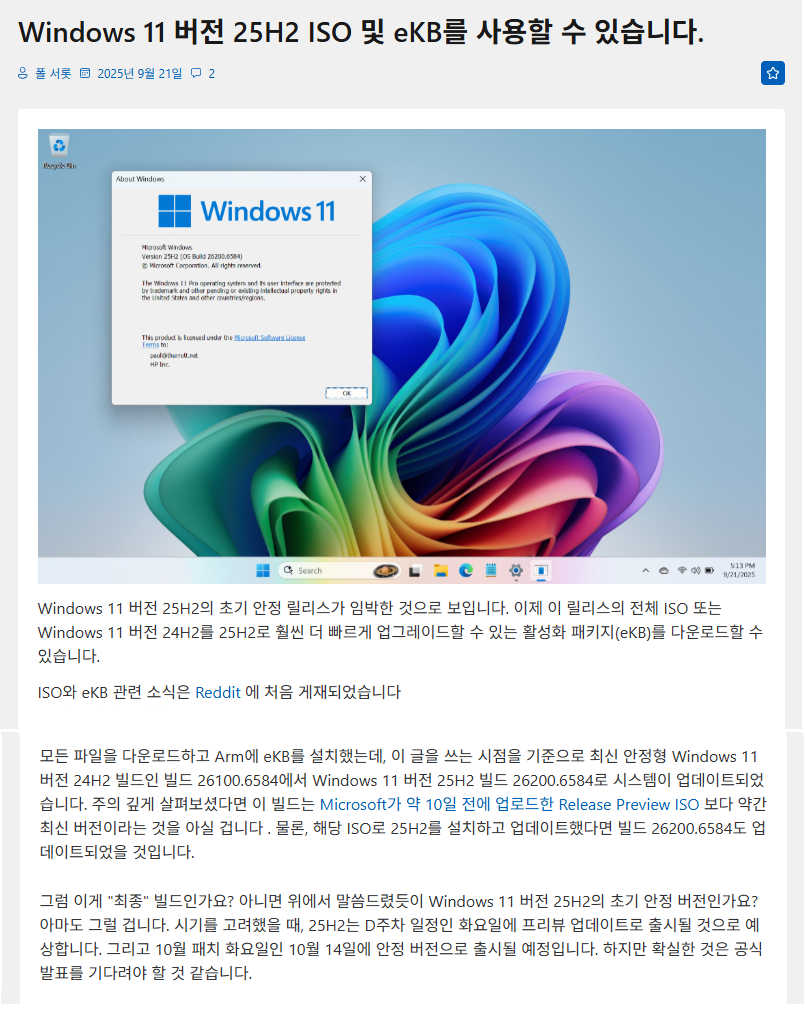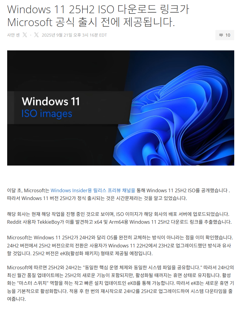 한글판은 위의 24H2 ISO 설치후에... 아래 기능 업데이트 패키지 설치하면 25H2로 바로 변신됩니다...ㅋ