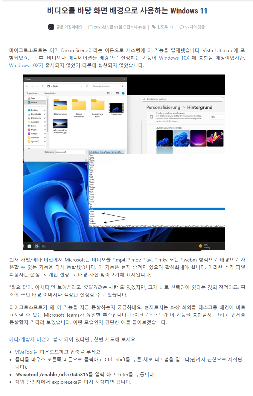 Windows 11 Beta/Dev 채널 빌드에서 비디오를 바탕 화면 배경으로 사용하는 방법