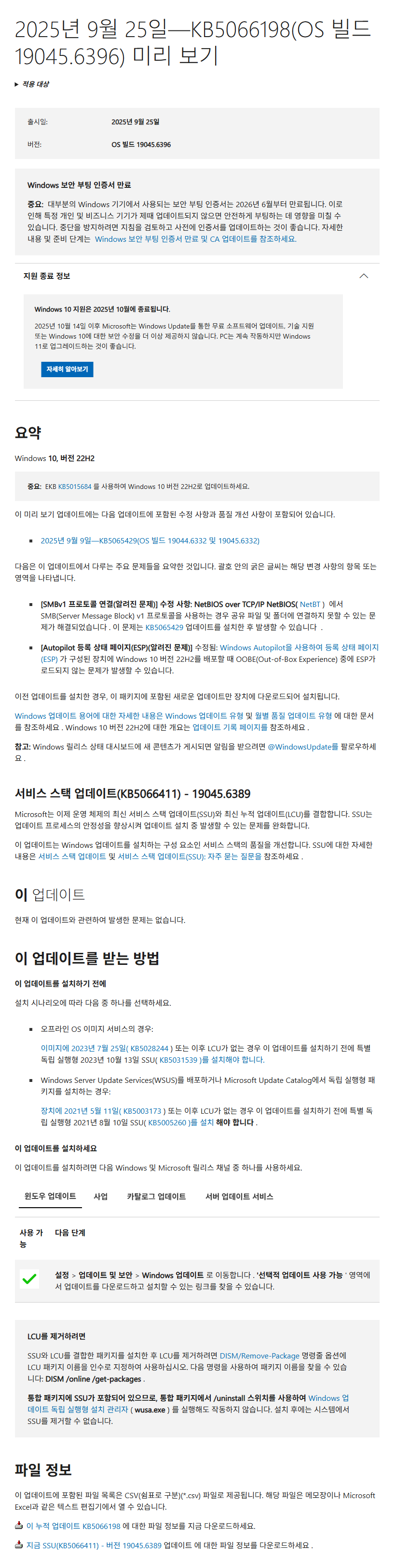 KB5066198 = 최신 누적 업데이트(19044.6396 / 19045.6396) (Last Cumulative update : LCU) ( 2025-09-25 )