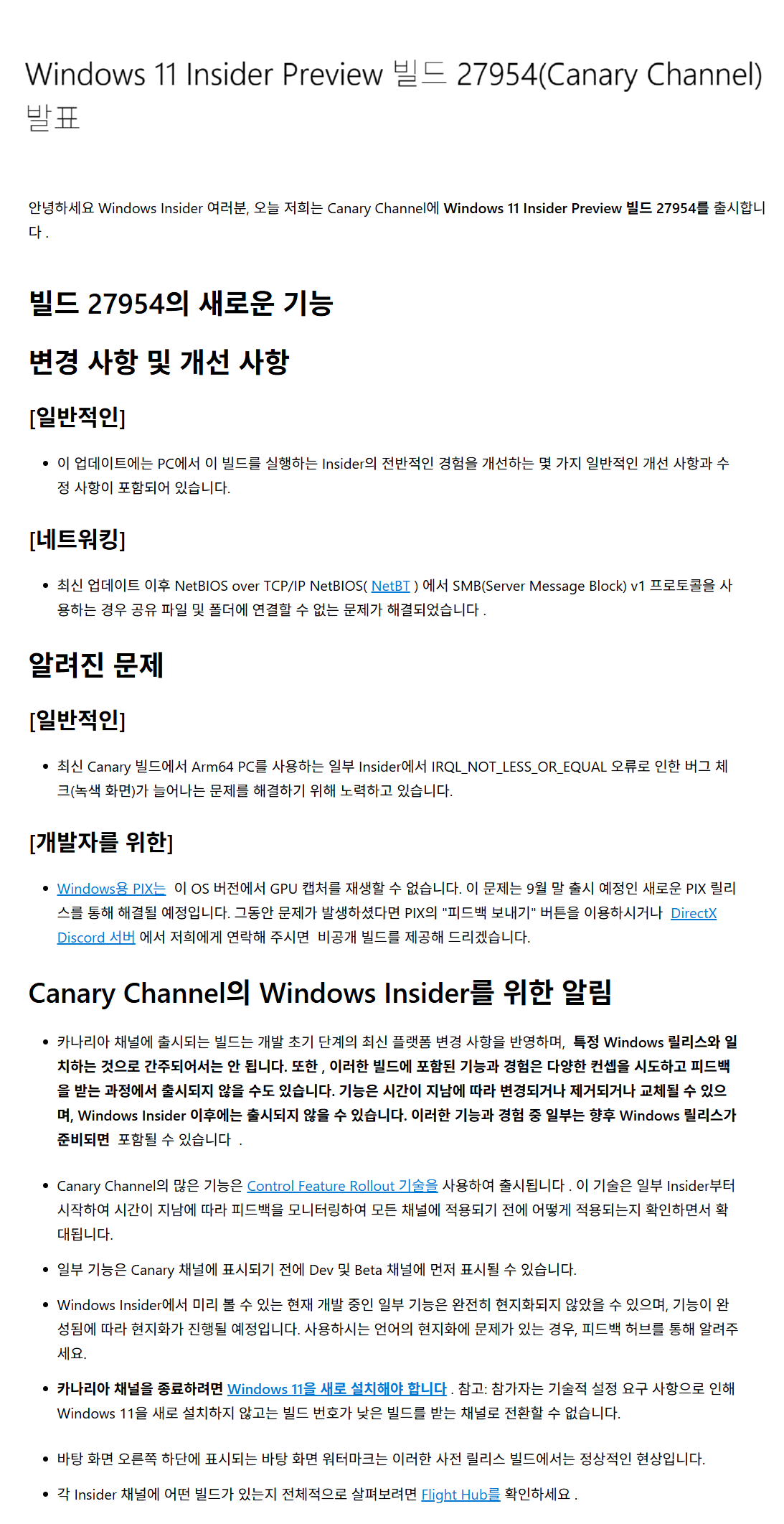 - Canary Channel 은 플랫폼 변경 사항(예: Windows 커널 및 새로운 API에 대한 주요 업데이트)을 미리 볼 수 있는 곳입니다. 이러한 변경 사항은 특정 Windows 릴리스에 묶이지 않으며 전혀 제공되지 않을 수도 있습니다. 제공되는 설명서가 거의 없으며 빌드가 매우 불안정할 가능성이 높습니다. 이 채널은 매우 기술적인 사용자에게 가장 적합합니다.