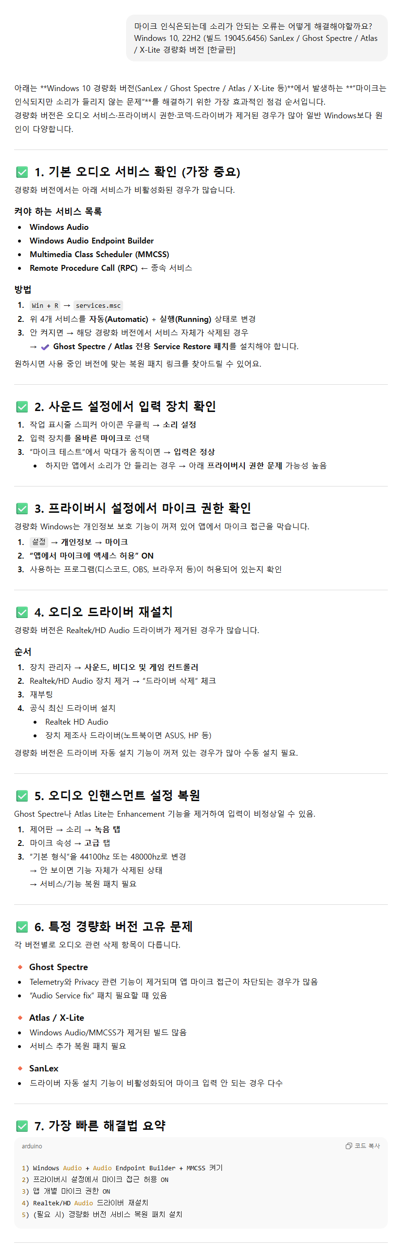 말씀하신 Windows 10 SanLex 버전은 정식 Microsoft 배포판이 아니라, 누군가 커스터마이즈한 트윅 / 경량화 버전일 가능성이 높습니다. 이런 경우 대부분의 문제는 다음 두 가지 중 하나에서 발생합니다: