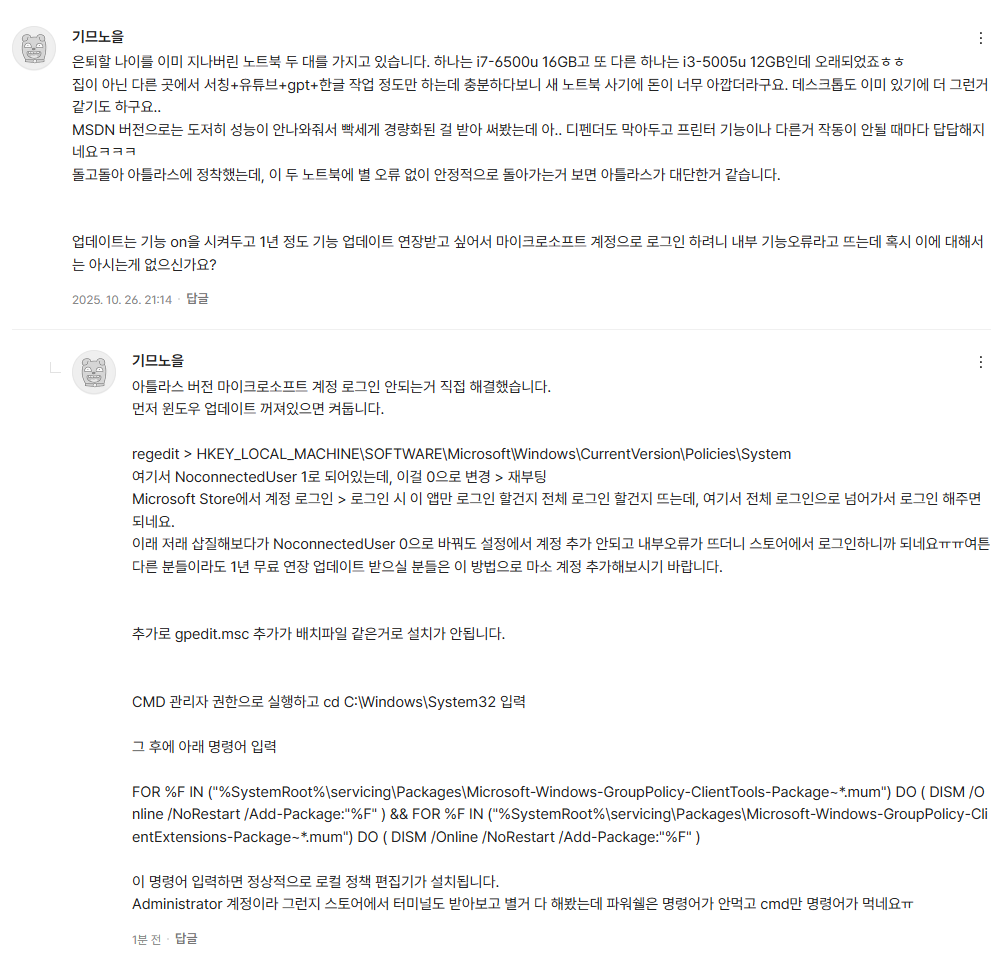 https://atlasos.net/downloads 위 링크에서 프로그램 받아서 직접 트윅하시면 됩니다. 트윅시 디렌더는 꺼놓고 하세요