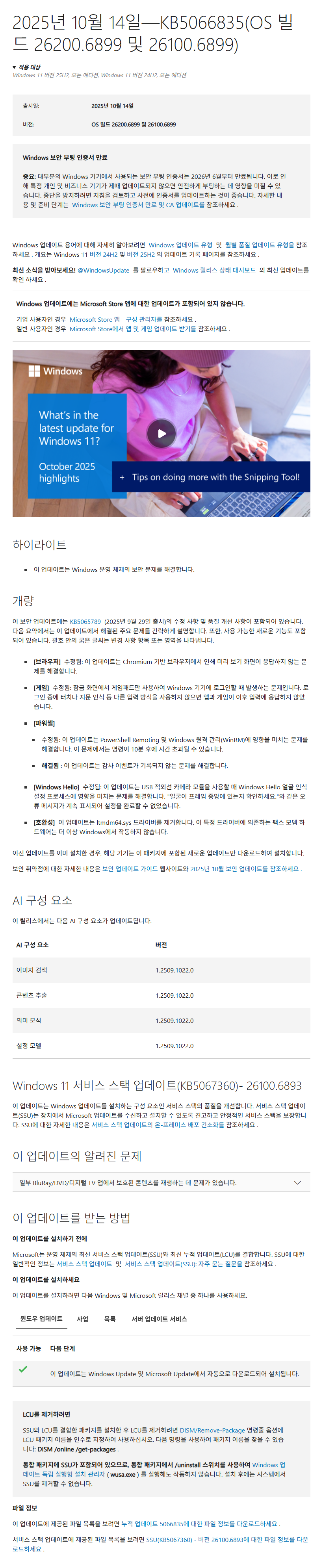 KB5066835 = 최신 누적 업데이트(26100.6899) (Last Cumulative update : LCU) (2025-10-14)