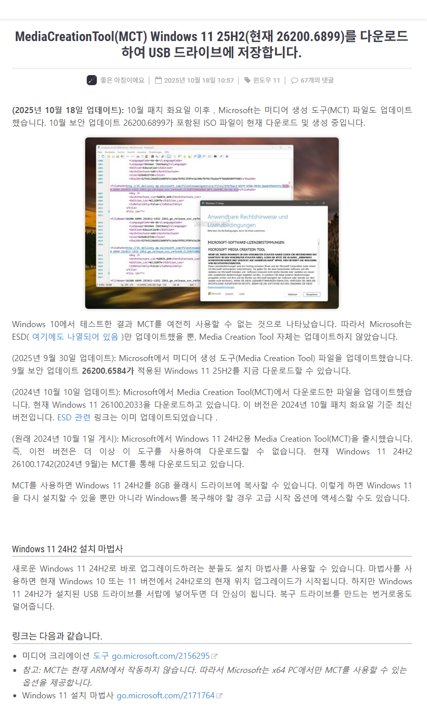 MediaCreationTool(MCT) Windows 11 25H2(현재 26200.6899)를 다운로드하여 USB 드라이브에 저장합니다