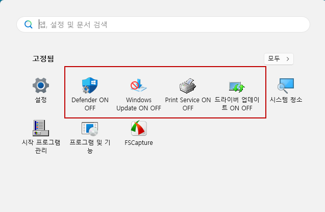 랜섬웨어 방지 때문에 어쩔수 없는 선택입니다...ㅠ - ⇒ 시작 메뉴 타일에 보시면 "Windows Update ON OFF, Print Service ON OFF" 프로그램이 있습니다.