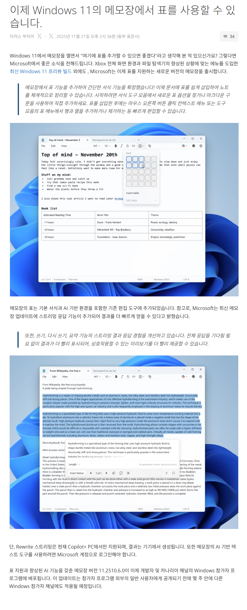 MS, Windows 11의 메모장에서 표 기능을 추가