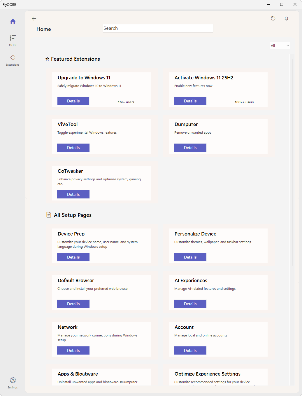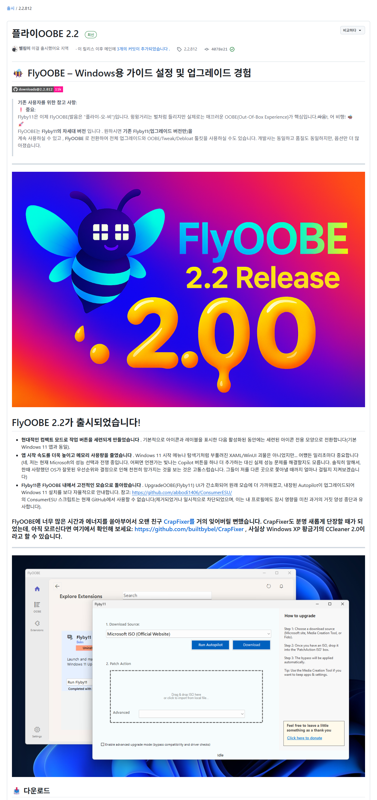 | 플라이OOBE 2.2 | 업그레이드 + OOBE 툴킷 | • Windows 10 → 11 업그레이드 • 전체 OOBE 사용자 지정 • 조정 및 디블로트 도구 • 스크립트 가능한 설치 확장 |