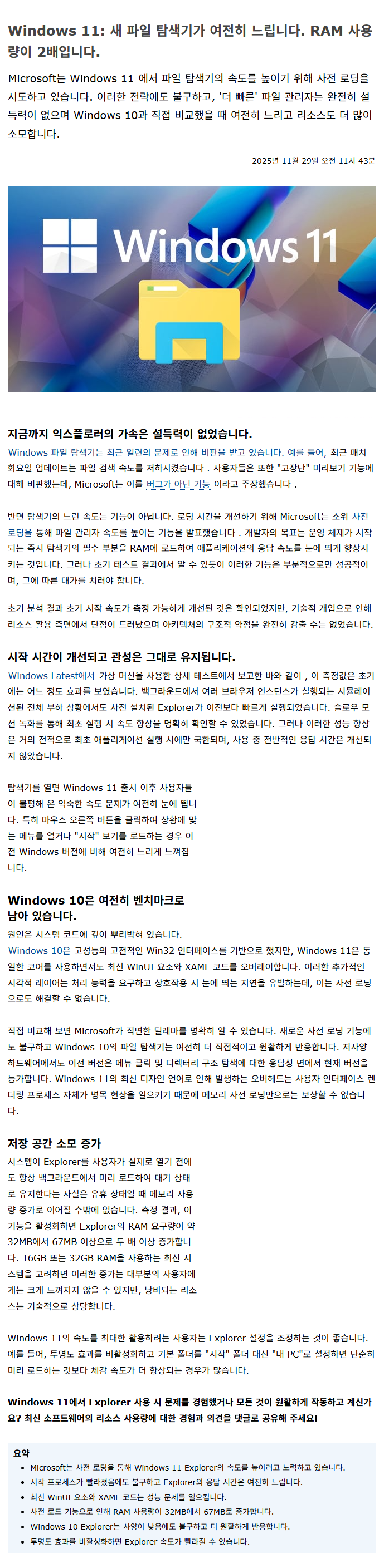 Windows 11의 '더 빠른' 파일 탐색기는 여전히 Windows 10보다 느리고 추가 RAM을 사용합니다.