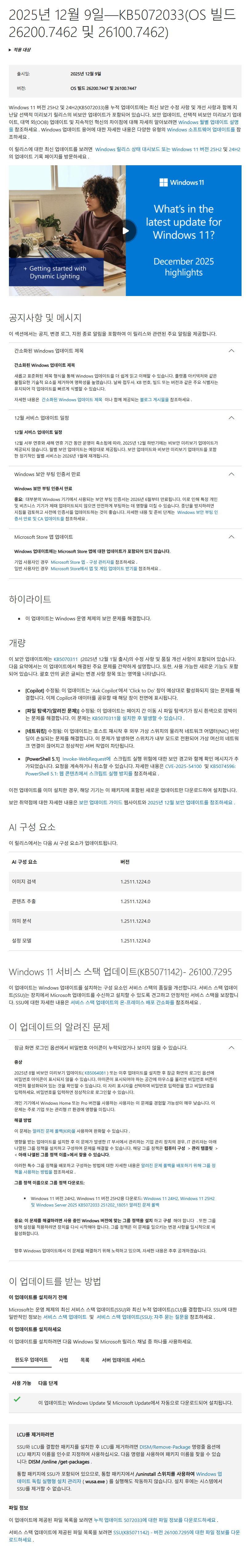 KB5072033 = 최신 누적 업데이트(26200.7462) (Last Cumulative update : LCU) (2025-12-09)