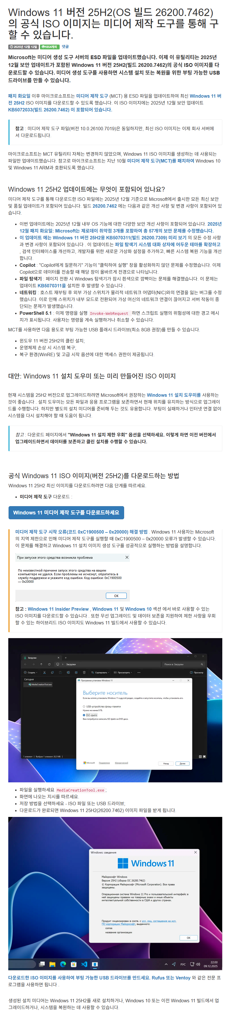 Windows 11 버전 25H2(OS 빌드 26200.7462)의 공식 ISO 이미지는 미디어 제작 도구(MCT)를 통해 구할 수 있습니다.