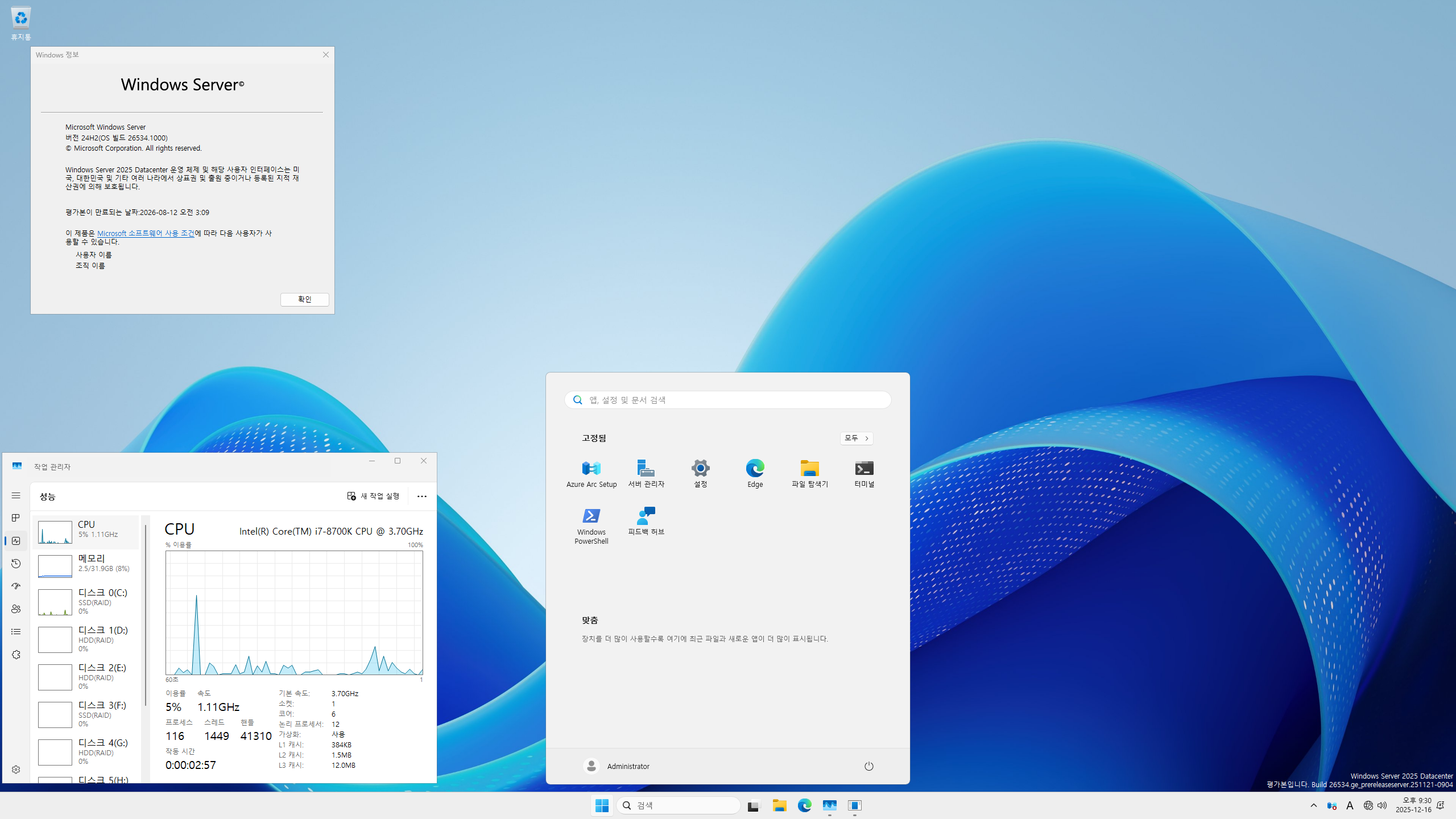 Windows Server vNext Insider Preview 빌드 26534 설치 완료