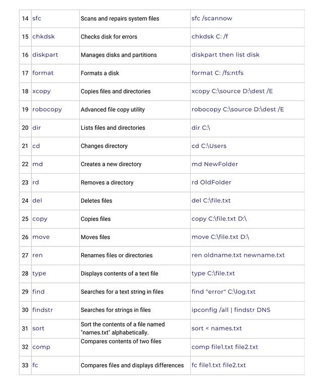| 17 | xcopy | 파일과 디렉토리를 복사합니다. | xcopy C:\Source D:\Dest /E |