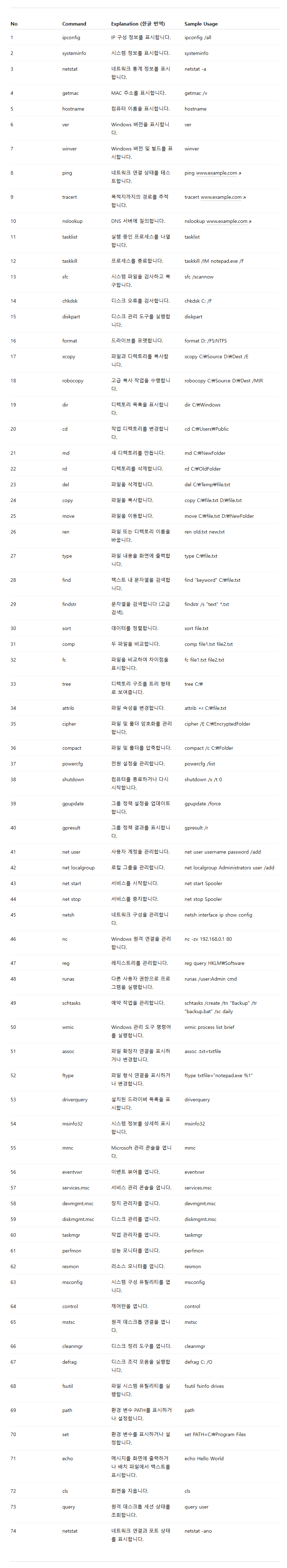 | 74 | netstat | 네트워크 연결과 포트 상태를 표시합니다. | netstat -ano |