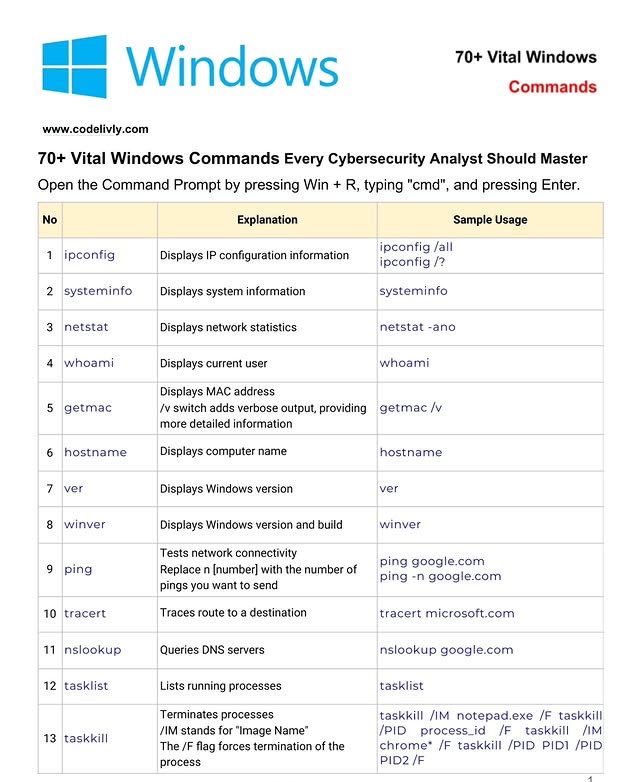 | 1 | ipconfig | IP 구성 정보를 표시합니다. | ipconfig /all |