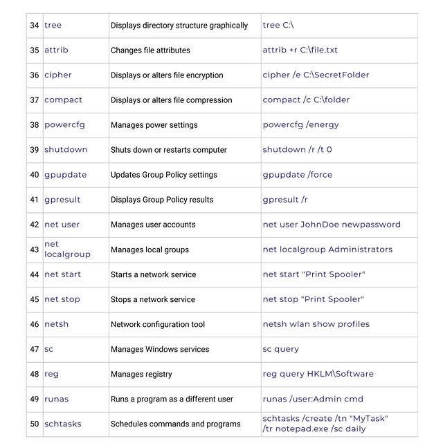 | 35 | cipher | 파일 및 폴더 암호화를 관리합니다. | cipher /E C:\EncryptedFolder |